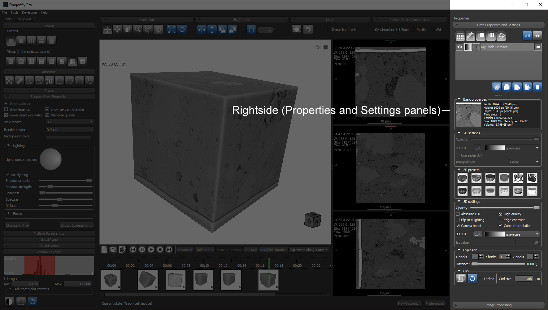 Right… The right side of the Dragonfly interface is the default location for the Data Properties and Settings panel, which provides information and settings for selected objects. Additional panels for processing objects, such as the Dataset Cropper, Dataset Sampler, and Convert Dataset, can also be accessed here (see Data Properties and Settings Panel).