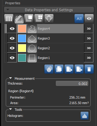 You can use the Region tools to select a portion of an image. Measurements are shown with the annotation in 2D and 3D views and are also available in the lower section of the Data Properties and Settings pane, as shown below. Other parameters, such as the minimum, maximum and mean values of a dataset within the region, are available in region histograms (see Plotting Region Histograms).