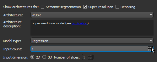 Note If you chose to train your model in 3D, then additional options will appear for the input, as shown below. See Configuring Multi-Slice Inputs for information about selecting reference slices and spacing values.