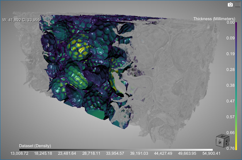 Dragonfly offers the opportunity to view objects in both perspective and orthographic projection modes. In the familiar and default perspective mode, objects are subject to foreshortening and will appear smaller as their distance from the camera increases. In the parallel projection of orthographic mode, there is no foreshortening or vanishing point and dimensions can be communicated unambiguously.