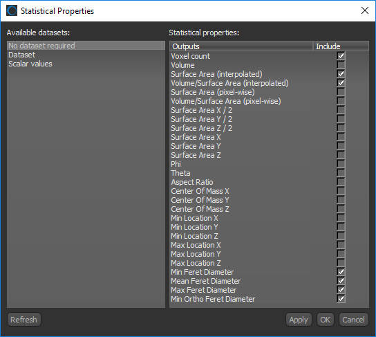 Click the Settings button at the top of the Object Analysis dialog to open the Statistical Properties dialog, shown below. You should note that some properties are available without a dataset, while others require a dataset. You can also include scalar values previously calculated for the selected multi-ROI in your current analysis.